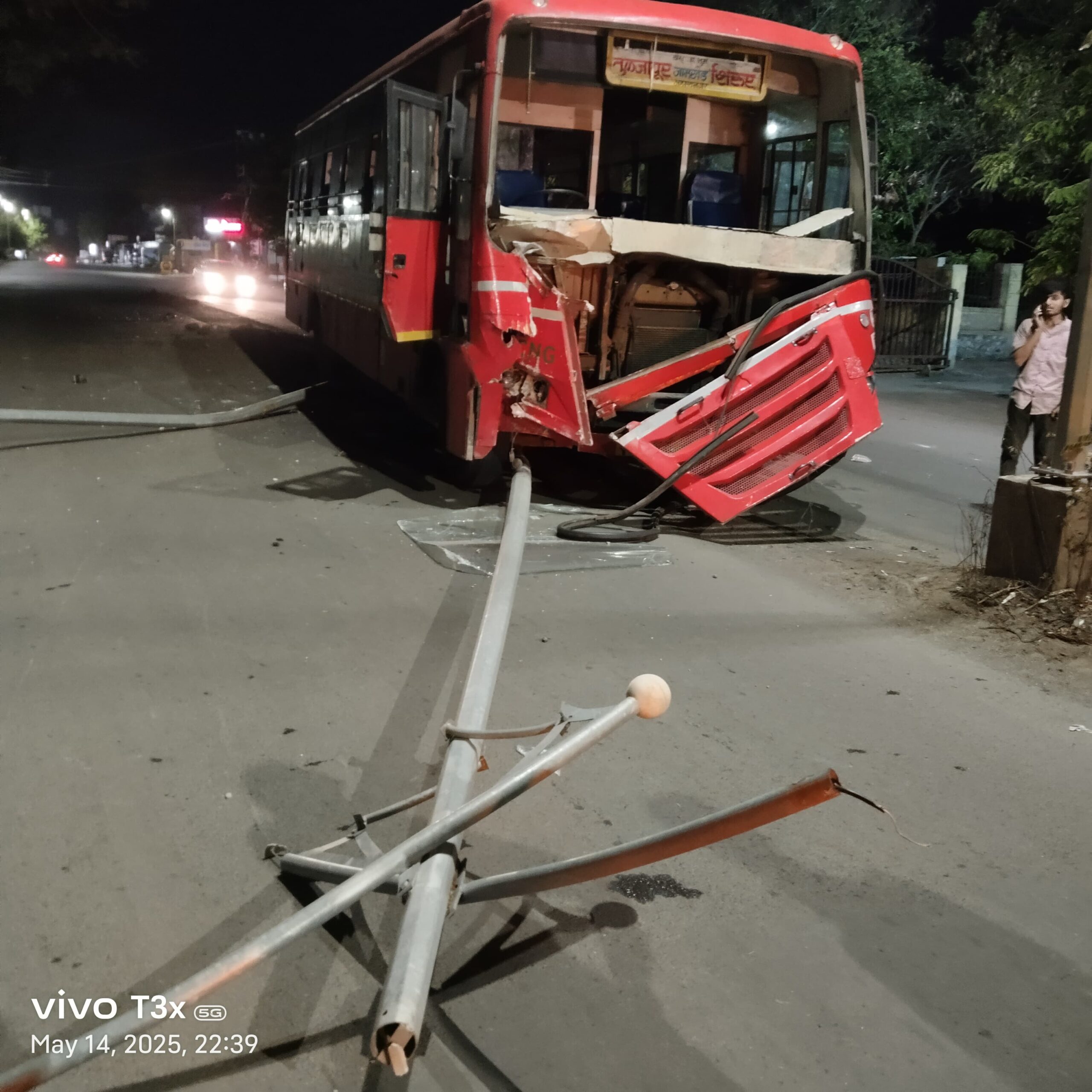 शिरुर तहसिल कार्यालया समोरील रस्त्याच्या मध्यभागी दुभाजकावर असणा-या लाईटीचा खांबाना एस. टी बसेस ने जोरदार धडक दिली . धडकेत रस्त्याच्या दुभाजकावरील दोन वीजेचे खांब उन्मळून रस्त्यात आडवे .