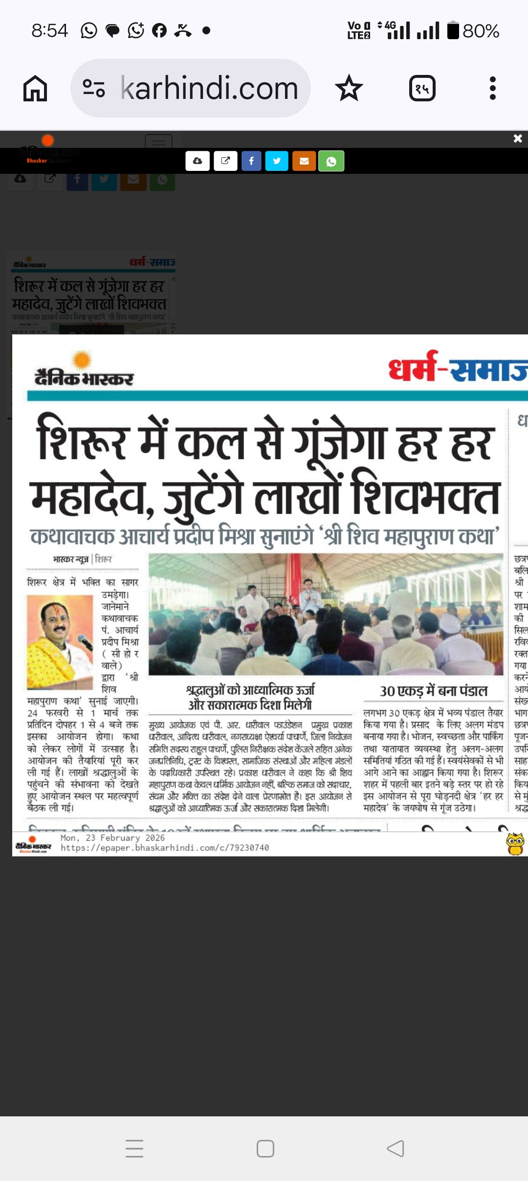 शिरूर {डेली न्यूज पोस्ट टीम 24}: प्रभू श्री रामलिंगाच्या पदस्पर्शाने पावन झालेल्या शिरूर नगरीत सध्या ‘हर हर महादेव’चा जयघोष दुमदुमत आहे. आंतरराष्ट्रीय ख्यातीचे कथावाचक पं. आचार्य प्रदीपजी मिश्रा यांच्या अमृतवाणीमधून रंगणाऱ्या भव्य श्री शिव महापुराण कथेच्या श्रवणासाठी राज्यासह देशभरातून भाविकांचे लोंढे शिरूरकडे वळत आहेत.