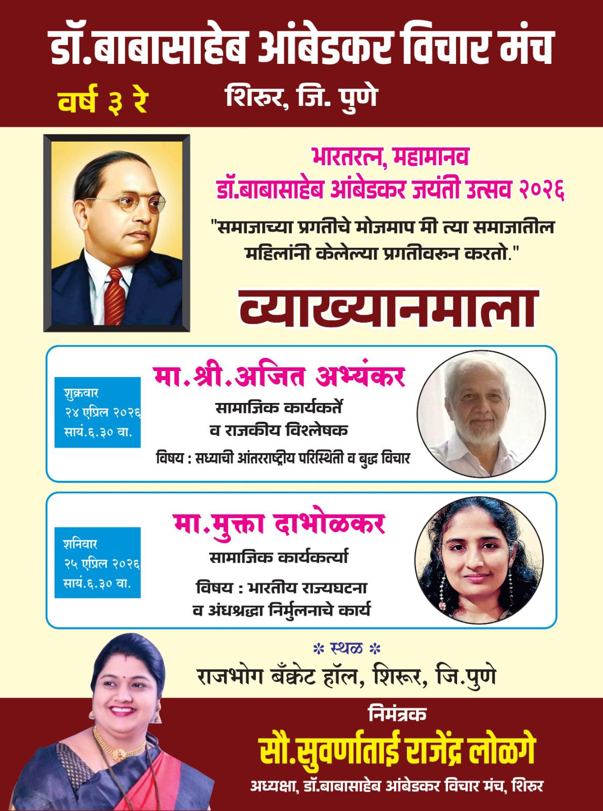 शिरूर, { डेली न्यूज पोस्ट टीम 24}:शहरातील भारतरत्न डॉ. बाबासाहेब आंबेडकर विचार मंचतर्फे भारतरत्न डॉ. बाबासाहेब आंबेडकर यांच्या जयंती उत्सवानिमित्त व्याख्यानमालेचे आयोजन करण्यात आले आहे. सामाजिक व बौद्धिक विषयांवर आधारित ही व्याख्यानमाला २४ व २५ एप्रिल रोजी सायंकाळी ६.३० वाजता पार पडणार आहे.